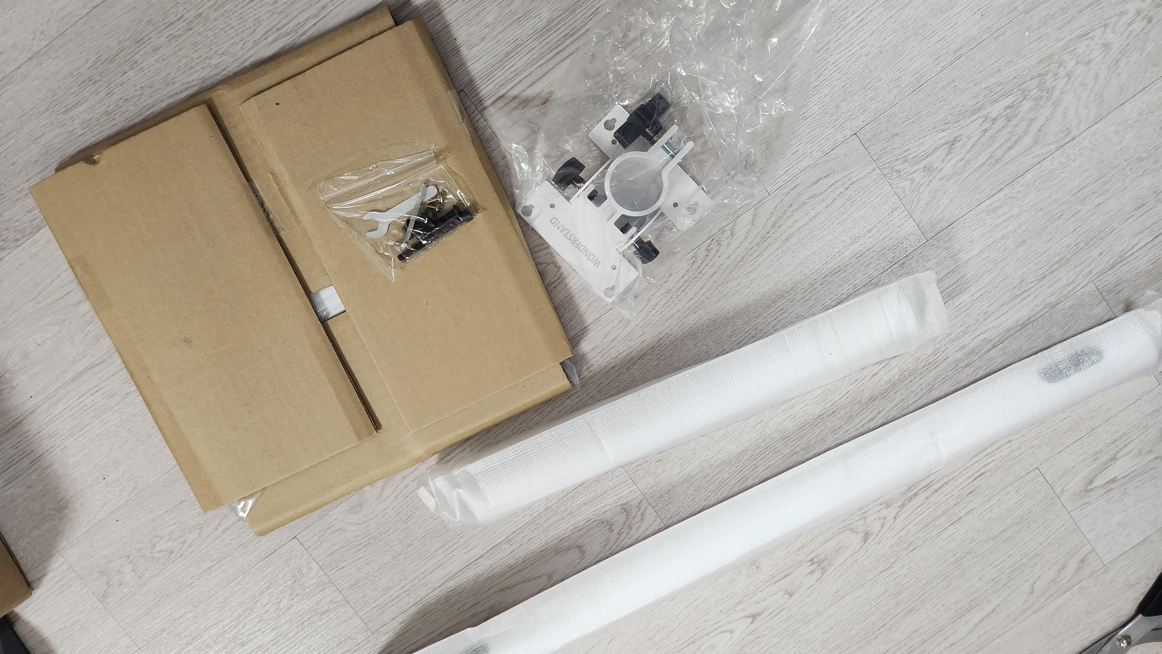 두 개의 봉과 조임쇠 그리고 나사들이 들어있다