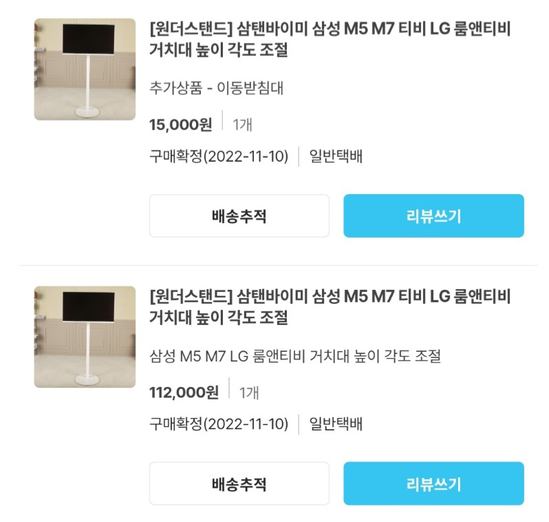- 특이사항 : 이동 받침대(바퀴 달린 받침대) 15,000원 추가 구입, 여자 혼자 조립 어려움 (무거운 받침), LG룸앤티비 갖고 있어서 샀음.